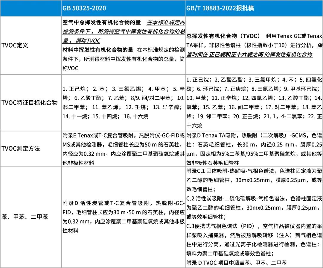从上述对比可见,两个标准中 TVOC 和相关项目存在一定差异,但与旧版标准相对比都进行了较多修订。